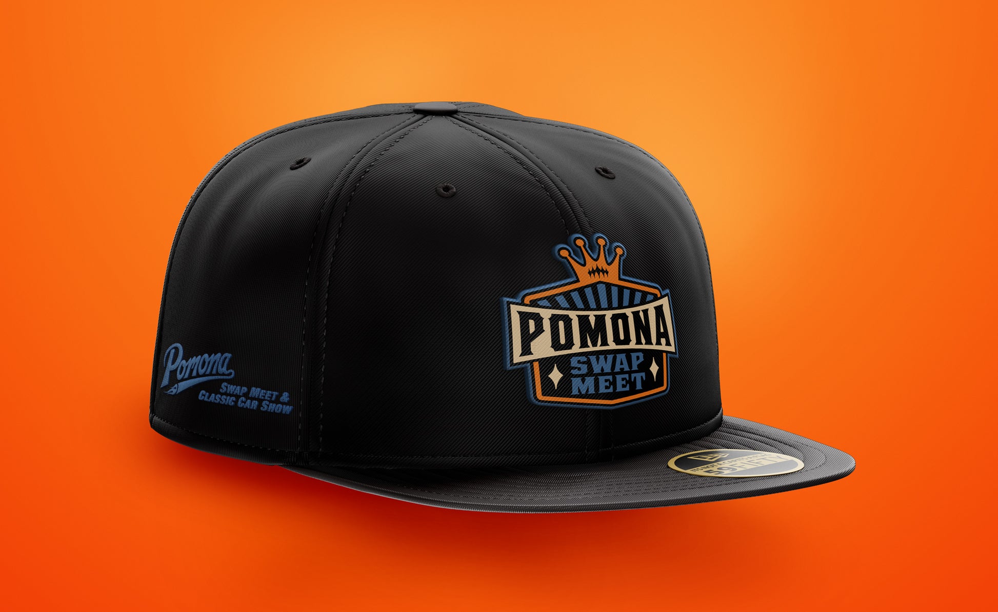 The Crown New Era 9FIFTY Snapback hat is all black and features a colorful embroidered crown logo centered on the front panels. The Pomona Swap Meet logo is embroidered at the right side. The 9FIFTY features an adjustable snapback closure at the rear.
